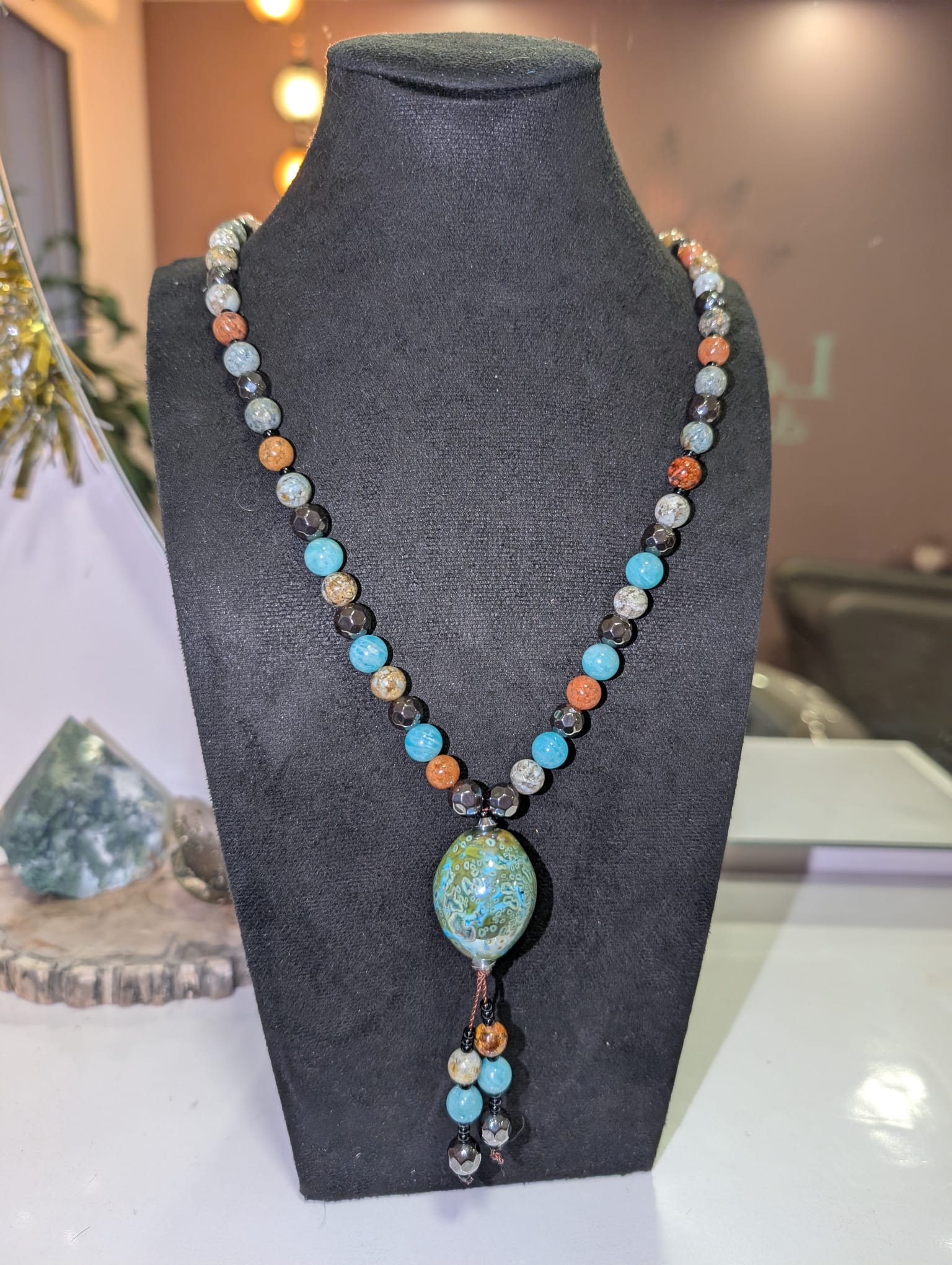 Collier Hématite facettée, Amazonite & Jaspe océan