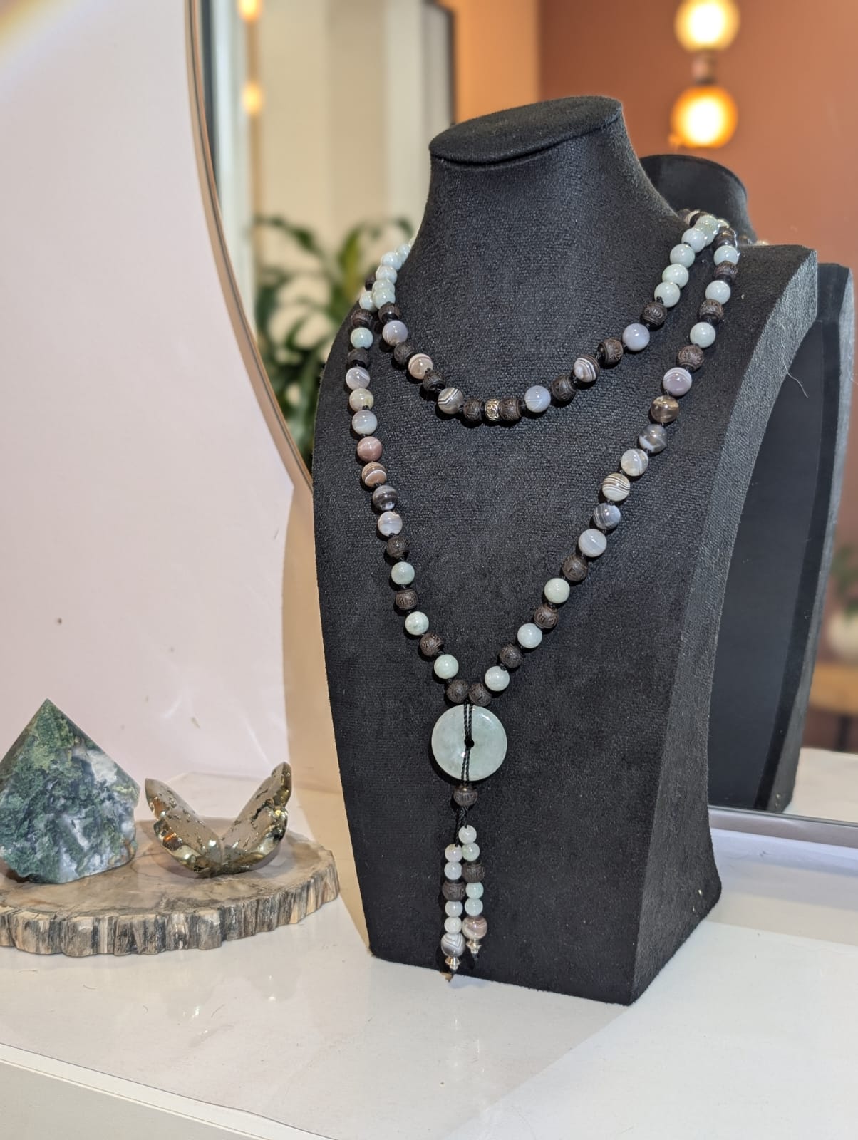 Porté autour du cou ou du poignet, le mala agit comme une protection énergétique et une source constante de vibrations positives.